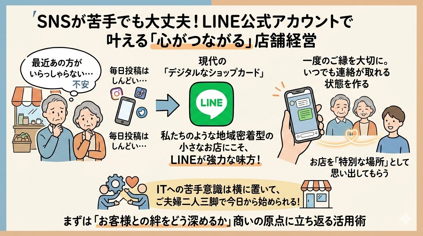 この記事では、ITへの苦手意識を一旦横に置いて、ご夫婦二人三脚で今日から始められる「LINEを使った商いのカタチ」をご提案します。難しい設定の話は後回しにして、まずは「お客様との絆をどう深めるか」という、商いの原点に立ち返った活用術をお伝えします。読み終える頃には、レジ横の風景が少し違って見えるはずです。